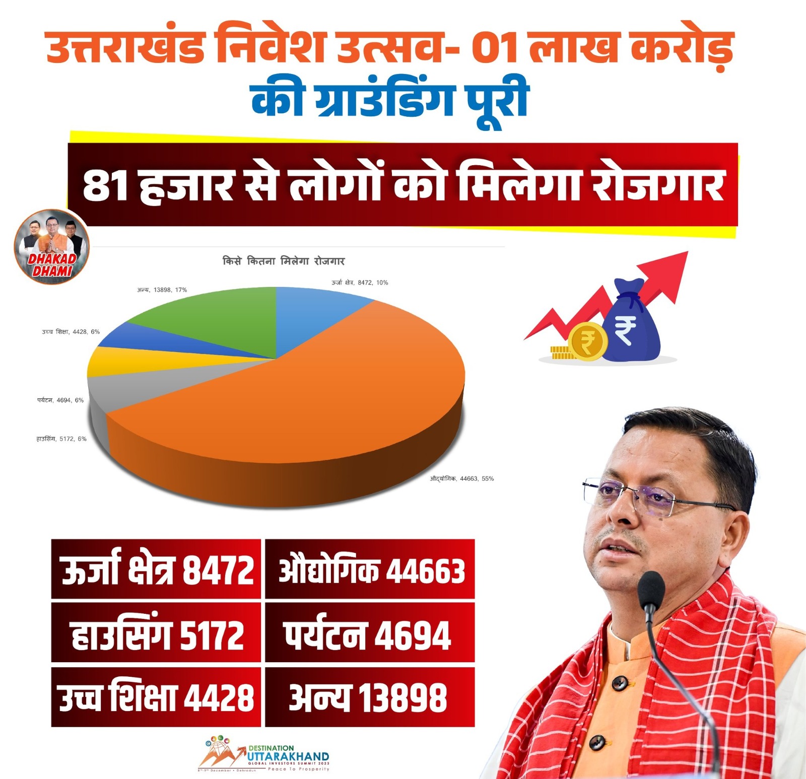 इस निवेश से प्रदेश में 81,000 से अधिक लोगों को प्रत्यक्ष और अप्रत्यक्ष रूप से रोजगार मिलने की संभावना है। यह पहली बार है जब प्रदेश में किए गए निवेश करारों का 33% से अधिक हिस्सा धरातल पर उतरने में सफल हुआ है। इससे उत्तराखंड देश के निवेश मानचित्र पर एक भरोसेमंद और सक्रिय राज्य के रूप में उभरा है।