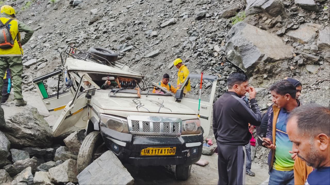 रुद्रप्रयाग। सोमवार सुबह जनपद रुद्रप्रयाग के मुनकटिया लैंडस्लाइड जोन में ऊपर से गिरे भारी पत्थर की चपेट में आकर एक मैक्स बोलेरो वाहन दुर्घटनाग्रस्त हो गया। वाहन में कुल 11 सवारियां थीं। इस दर्दनाक हादसे में 2 व्यक्तियों की दुःखद मृत्यु हो गई, जबकि 3 अन्य व्यक्ति घायल हुए। सूचना प्राप्त होते ही एसडीआरएफ टीम त्वरित गति से घटनास्थल पर पहुँची और स्थानीय नागरिकों के सहयोग से राहत एवं बचाव कार्य संचालित किया। एसडीआरएफ जवानों ने घायलों को सुरक्षित निकालकर सोनप्रयाग अस्पताल पहुँचाया। यह घटना पहाड़ी क्षेत्रों में निरंतर हो रहे भूस्खलनों की गंभीरता को दर्शाती है। एसडीआरएफ टीम हर कठिन परिस्थिति में तत्परता से राहत व बचाव कार्यों में जुटी हुई है।