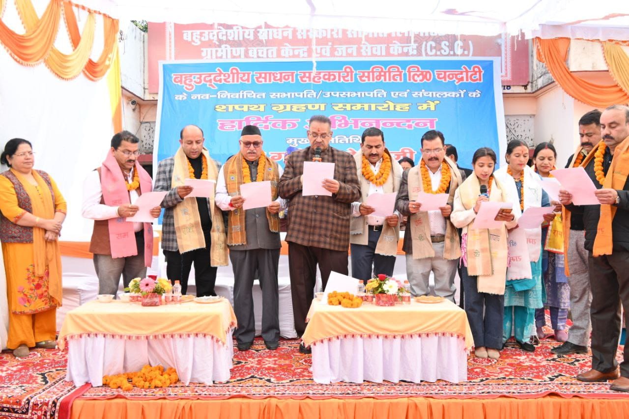 देहरादून। कैबिनेट मंत्री गणेश जोशी ने वीरवार को देहरादून स्थित ग्रीन व्यू गार्डन, सिनोला में बहुउद्देशीय साधन सहकारी समिति लिमिटेड चन्द्रोटी के नव-निर्वाचित सभापति, उपसभापति एवं संचालकों के शपथ ग्रहण समारोह में बतौर मुख्य अतिथि प्रतिभाग किया।